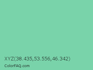 XYZ 38.435,53.556,46.342 Color is a light green color and the nearest color is Medium Aquamarine #66ddaa. Hex code #79d3aa and RGB value is rgb(121,211,170). In RGB color space, this color is composed of 47% red, 83% green, 67% blue, In CMYK color space, this color is composed of 43% cyan, 0% magenta, 19% yellow , 17% black , In HSL color space, this color has a hue angle of 153° , 51% saturation and 65% lightness.