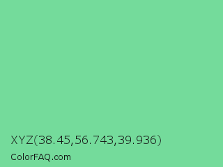 XYZ 38.45,56.743,39.936 Color is a light green color and the nearest color is Medium Aquamarine #66ddaa. Hex code #74db9b and RGB value is rgb(116,219,155). In RGB color space, this color is composed of 45% red, 86% green, 61% blue, In CMYK color space, this color is composed of 47% cyan, 0% magenta, 29% yellow , 14% black , In HSL color space, this color has a hue angle of 143° , 59% saturation and 66% lightness.