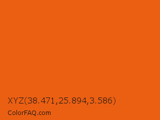 XYZ 38.471,25.894,3.586 Color is a normal orange color and the nearest color is Vivid Vermilion #e56024. Hex code #eb5f13 and RGB value is rgb(235,95,19). In RGB color space, this color is composed of 92% red, 37% green, 7% blue, In CMYK color space, this color is composed of 0% cyan, 60% magenta, 92% yellow , 8% black , In HSL color space, this color has a hue angle of 21° , 85% saturation and 50% lightness.