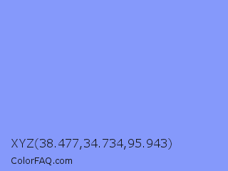 XYZ 38.477,34.734,95.943 Color is a light blue color and the nearest color is Portage #8b9fee. Hex code #8599fb and RGB value is rgb(133,153,251). In RGB color space, this color is composed of 52% red, 60% green, 98% blue, In CMYK color space, this color is composed of 47% cyan, 39% magenta, 0% yellow , 2% black , In HSL color space, this color has a hue angle of 230° , 94% saturation and 75% lightness.
