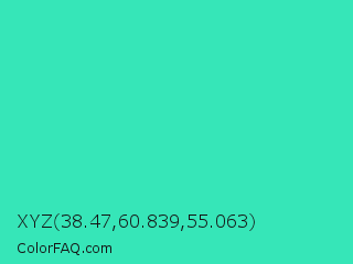 XYZ 38.47,60.839,55.063 Color is a normal cyan color and the nearest color is Turquoise PWG #30d5c8. Hex code #36e6b8 and RGB value is rgb(54,230,184). In RGB color space, this color is composed of 21% red, 90% green, 72% blue, In CMYK color space, this color is composed of 77% cyan, 0% magenta, 20% yellow , 10% black , In HSL color space, this color has a hue angle of 164° , 78% saturation and 56% lightness.