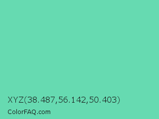 XYZ 38.487,56.142,50.403 Color is a light green color and the nearest color is Medium Aquamarine #66ddaa. Hex code #66dab1 and RGB value is rgb(102,218,177). In RGB color space, this color is composed of 40% red, 85% green, 69% blue, In CMYK color space, this color is composed of 53% cyan, 0% magenta, 19% yellow , 15% black , In HSL color space, this color has a hue angle of 159° , 61% saturation and 63% lightness.