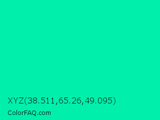 XYZ 38.511,65.26,49.095 Color is a normal green color and the nearest color is Medium Spring Green #00fa9a. Hex code #00f0ab and RGB value is rgb(0,240,171). In RGB color space, this color is composed of 0% red, 94% green, 67% blue, In CMYK color space, this color is composed of 100% cyan, 0% magenta, 29% yellow , 6% black , In HSL color space, this color has a hue angle of 163° , 100% saturation and 47% lightness.