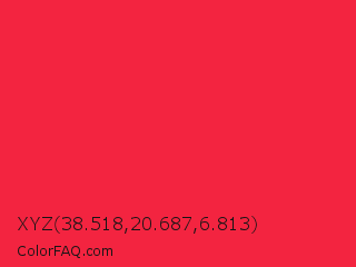 XYZ 38.518,20.687,6.813 Color is a normal red color and the nearest color is Imperial Red #ed2939. Hex code #f32440 and RGB value is rgb(243,36,64). In RGB color space, this color is composed of 95% red, 14% green, 25% blue, In CMYK color space, this color is composed of 0% cyan, 85% magenta, 74% yellow , 5% black , In HSL color space, this color has a hue angle of 352° , 90% saturation and 55% lightness.
