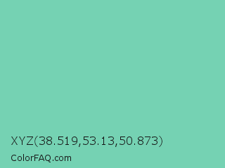 XYZ 38.519,53.13,50.873 Color is a light green color and the nearest color is Downy #6fd0c5. Hex code #75d2b3 and RGB value is rgb(117,210,179). In RGB color space, this color is composed of 46% red, 82% green, 70% blue, In CMYK color space, this color is composed of 44% cyan, 0% magenta, 15% yellow , 18% black , In HSL color space, this color has a hue angle of 160° , 51% saturation and 64% lightness.