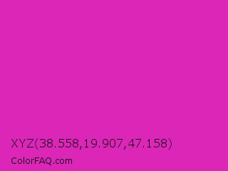 XYZ 38.558,19.907,47.158 Color is a normal magenta color and the nearest color is Frostbite #e936a7. Hex code #db26b8 and RGB value is rgb(219,38,184). In RGB color space, this color is composed of 86% red, 15% green, 72% blue, In CMYK color space, this color is composed of 0% cyan, 83% magenta, 16% yellow , 14% black , In HSL color space, this color has a hue angle of 312° , 72% saturation and 50% lightness.