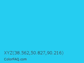 XYZ 38.562,50.827,90.216 Color is a normal cyan color and the nearest color is Spiro Disco Ball #0fc0fc. Hex code #25cef0 and RGB value is rgb(37,206,240). In RGB color space, this color is composed of 15% red, 81% green, 94% blue, In CMYK color space, this color is composed of 85% cyan, 14% magenta, 0% yellow , 6% black , In HSL color space, this color has a hue angle of 190° , 87% saturation and 54% lightness.