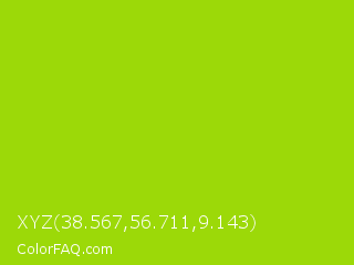 XYZ 38.567,56.711,9.143 Color is a normal lime color and the nearest color is Vivid Lime Green #a6d608. Hex code #9cd908 and RGB value is rgb(156,217,8). In RGB color space, this color is composed of 61% red, 85% green, 3% blue, In CMYK color space, this color is composed of 28% cyan, 0% magenta, 96% yellow , 15% black , In HSL color space, this color has a hue angle of 78° , 93% saturation and 44% lightness.