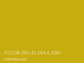 XYZ 38.583,42.064,6.538 Color is a normal yellow color and the nearest color is Buddha Gold #c1a004. Hex code #c7ad0f and RGB value is rgb(199,173,15). In RGB color space, this color is composed of 78% red, 68% green, 6% blue, In CMYK color space, this color is composed of 0% cyan, 13% magenta, 92% yellow , 22% black , In HSL color space, this color has a hue angle of 52° , 86% saturation and 42% lightness.