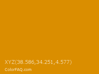 XYZ 38.586,34.251,4.577 Color is a normal orange color and the nearest color is Harvest Gold #da9100. Hex code #da8e00 and RGB value is rgb(218,142,0). In RGB color space, this color is composed of 85% red, 56% green, 0% blue, In CMYK color space, this color is composed of 0% cyan, 35% magenta, 100% yellow , 15% black , In HSL color space, this color has a hue angle of 39° , 100% saturation and 43% lightness.