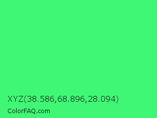 XYZ 38.586,68.896,28.094 Color is a light green color and the nearest color is UFO Green #3cd070. Hex code #40f775 and RGB value is rgb(64,247,117). In RGB color space, this color is composed of 25% red, 97% green, 46% blue, In CMYK color space, this color is composed of 74% cyan, 0% magenta, 53% yellow , 3% black , In HSL color space, this color has a hue angle of 137° , 92% saturation and 61% lightness.