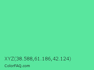 XYZ 38.588,61.186,42.124 Color is a light green color and the nearest color is Medium Aquamarine #66ddaa. Hex code #59e69e and RGB value is rgb(89,230,158). In RGB color space, this color is composed of 35% red, 90% green, 62% blue, In CMYK color space, this color is composed of 61% cyan, 0% magenta, 31% yellow , 10% black , In HSL color space, this color has a hue angle of 149° , 74% saturation and 63% lightness.
