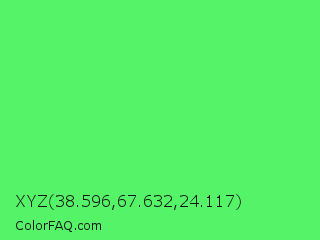 XYZ 38.596,67.632,24.117 Color is a light green color and the nearest color is Screamin Green #66ff66. Hex code #55f468 and RGB value is rgb(85,244,104). In RGB color space, this color is composed of 33% red, 96% green, 41% blue, In CMYK color space, this color is composed of 65% cyan, 0% magenta, 57% yellow , 4% black , In HSL color space, this color has a hue angle of 127° , 88% saturation and 65% lightness.