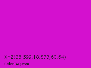 XYZ 38.599,18.873,60.64 Color is a normal magenta color and the nearest color is Deep Magenta #cc00cc. Hex code #d410cf and RGB value is rgb(212,16,207). In RGB color space, this color is composed of 83% red, 6% green, 81% blue, In CMYK color space, this color is composed of 0% cyan, 92% magenta, 2% yellow , 17% black , In HSL color space, this color has a hue angle of 302° , 86% saturation and 45% lightness.