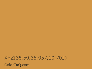 XYZ 38.59,35.957,10.701 Color is a normal orange color and the nearest color is Tussock #c5994b. Hex code #d29646 and RGB value is rgb(210,150,70). In RGB color space, this color is composed of 82% red, 59% green, 27% blue, In CMYK color space, this color is composed of 0% cyan, 29% magenta, 67% yellow , 18% black , In HSL color space, this color has a hue angle of 34° , 61% saturation and 55% lightness.