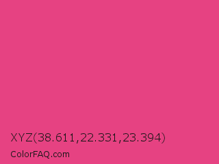XYZ 38.611,22.331,23.394 Color is a normal rose color and the nearest color is Cerise Pink #ec3b83. Hex code #e64282 and RGB value is rgb(230,66,130). In RGB color space, this color is composed of 90% red, 26% green, 51% blue, In CMYK color space, this color is composed of 0% cyan, 71% magenta, 43% yellow , 10% black , In HSL color space, this color has a hue angle of 337° , 77% saturation and 58% lightness.
