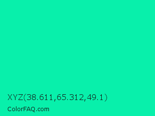 XYZ 38.611,65.312,49.1 Color is a normal green color and the nearest color is Medium Spring Green #00fa9a. Hex code #08f0ab and RGB value is rgb(8,240,171). In RGB color space, this color is composed of 3% red, 94% green, 67% blue, In CMYK color space, this color is composed of 97% cyan, 0% magenta, 29% yellow , 6% black , In HSL color space, this color has a hue angle of 162° , 94% saturation and 49% lightness.