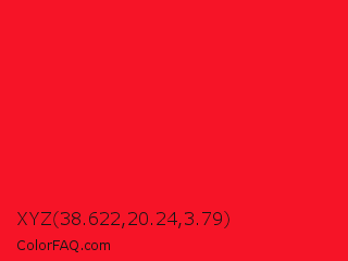 XYZ 38.622,20.24,3.79 Color is a normal red color and the nearest color is Red Pigment #ed1c24. Hex code #f61427 and RGB value is rgb(246,20,39). In RGB color space, this color is composed of 96% red, 8% green, 15% blue, In CMYK color space, this color is composed of 0% cyan, 92% magenta, 84% yellow , 4% black , In HSL color space, this color has a hue angle of 355° , 93% saturation and 52% lightness.