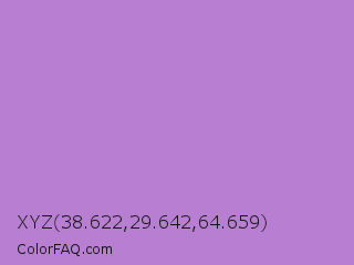 XYZ 38.622,29.642,64.659 Color is a light purple color and the nearest color is Lavender #b57edc. Hex code #b77ed2 and RGB value is rgb(183,126,210). In RGB color space, this color is composed of 72% red, 49% green, 82% blue, In CMYK color space, this color is composed of 13% cyan, 40% magenta, 0% yellow , 18% black , In HSL color space, this color has a hue angle of 281° , 48% saturation and 66% lightness.
