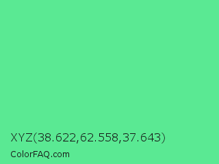 XYZ 38.622,62.558,37.643 Color is a light green color and the nearest color is Very Light Malachite Green #64e986. Hex code #5ae993 and RGB value is rgb(90,233,147). In RGB color space, this color is composed of 35% red, 91% green, 58% blue, In CMYK color space, this color is composed of 61% cyan, 0% magenta, 37% yellow , 9% black , In HSL color space, this color has a hue angle of 144° , 76% saturation and 63% lightness.