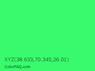 XYZ 38.633,70.345,26.01 Color is a normal green color and the nearest color is UFO Green #3cd070. Hex code #39fa6d and RGB value is rgb(57,250,109). In RGB color space, this color is composed of 22% red, 98% green, 43% blue, In CMYK color space, this color is composed of 77% cyan, 0% magenta, 56% yellow , 2% black , In HSL color space, this color has a hue angle of 136° , 95% saturation and 60% lightness.