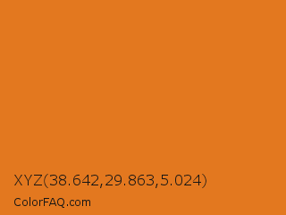XYZ 38.642,29.863,5.024 Color is a normal orange color and the nearest color is Tango #ed7a1c. Hex code #e3781f and RGB value is rgb(227,120,31). In RGB color space, this color is composed of 89% red, 47% green, 12% blue, In CMYK color space, this color is composed of 0% cyan, 47% magenta, 86% yellow , 11% black , In HSL color space, this color has a hue angle of 27° , 78% saturation and 51% lightness.