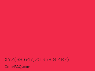 XYZ 38.647,20.958,8.487 Color is a normal red color and the nearest color is Red Crayola #ee204d. Hex code #f2294a and RGB value is rgb(242,41,74). In RGB color space, this color is composed of 95% red, 16% green, 29% blue, In CMYK color space, this color is composed of 0% cyan, 83% magenta, 69% yellow , 5% black , In HSL color space, this color has a hue angle of 350° , 89% saturation and 55% lightness.