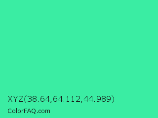 XYZ 38.64,64.112,44.989 Color is a normal green color and the nearest color is Eucalyptus #44d7a8. Hex code #3aeda3 and RGB value is rgb(58,237,163). In RGB color space, this color is composed of 23% red, 93% green, 64% blue, In CMYK color space, this color is composed of 76% cyan, 0% magenta, 31% yellow , 7% black , In HSL color space, this color has a hue angle of 155° , 83% saturation and 58% lightness.