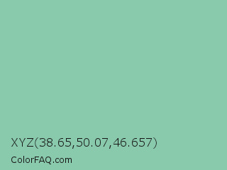 XYZ 38.65,50.07,46.657 Color is a light green color and the nearest color is Vista Blue #8fd6b4. Hex code #89c9ac and RGB value is rgb(137,201,172). In RGB color space, this color is composed of 54% red, 79% green, 67% blue, In CMYK color space, this color is composed of 32% cyan, 0% magenta, 14% yellow , 21% black , In HSL color space, this color has a hue angle of 153° , 37% saturation and 66% lightness.