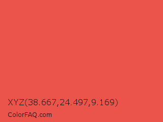 XYZ 38.667,24.497,9.169 Color is a light red color and the nearest color is Carmine Pink #eb4c42. Hex code #eb544a and RGB value is rgb(235,84,74). In RGB color space, this color is composed of 92% red, 33% green, 29% blue, In CMYK color space, this color is composed of 0% cyan, 64% magenta, 69% yellow , 8% black , In HSL color space, this color has a hue angle of 4° , 80% saturation and 61% lightness.