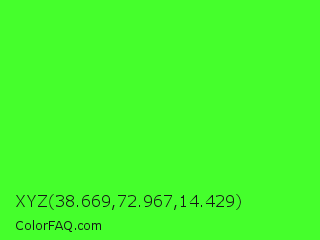 XYZ 38.669,72.967,14.429 Color is a normal green color and the nearest color is Neon Green #39ff14. Hex code #45ff2c and RGB value is rgb(69,255,44). In RGB color space, this color is composed of 27% red, 100% green, 17% blue, In CMYK color space, this color is composed of 73% cyan, 0% magenta, 83% yellow , 0% black , In HSL color space, this color has a hue angle of 113° , 100% saturation and 59% lightness.