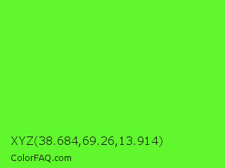 XYZ 38.684,69.26,13.914 Color is a normal green color and the nearest color is Spring Frost #87ff2a. Hex code #61f72e and RGB value is rgb(97,247,46). In RGB color space, this color is composed of 38% red, 97% green, 18% blue, In CMYK color space, this color is composed of 61% cyan, 0% magenta, 81% yellow , 3% black , In HSL color space, this color has a hue angle of 105° , 93% saturation and 57% lightness.
