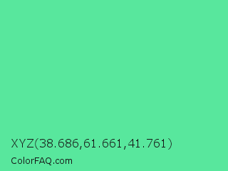 XYZ 38.686,61.661,41.761 Color is a light green color and the nearest color is Medium Aquamarine #66ddaa. Hex code #58e79d and RGB value is rgb(88,231,157). In RGB color space, this color is composed of 35% red, 91% green, 62% blue, In CMYK color space, this color is composed of 62% cyan, 0% magenta, 32% yellow , 9% black , In HSL color space, this color has a hue angle of 149° , 75% saturation and 63% lightness.