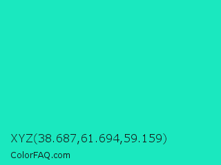 XYZ 38.687,61.694,59.159 Color is a normal cyan color and the nearest color is Turquoise PWG #30d5c8. Hex code #1ae8bf and RGB value is rgb(26,232,191). In RGB color space, this color is composed of 10% red, 91% green, 75% blue, In CMYK color space, this color is composed of 89% cyan, 0% magenta, 18% yellow , 9% black , In HSL color space, this color has a hue angle of 168° , 82% saturation and 51% lightness.