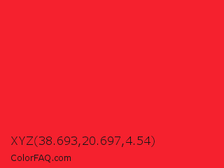 XYZ 38.693,20.697,4.54 Color is a normal red color and the nearest color is Red Pigment #ed1c24. Hex code #f5212e and RGB value is rgb(245,33,46). In RGB color space, this color is composed of 96% red, 13% green, 18% blue, In CMYK color space, this color is composed of 0% cyan, 87% magenta, 81% yellow , 4% black , In HSL color space, this color has a hue angle of 356° , 91% saturation and 55% lightness.