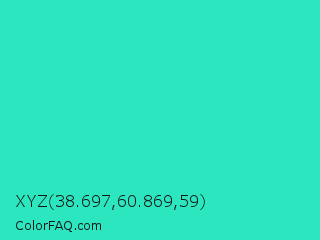 XYZ 38.697,60.869,59 Color is a normal cyan color and the nearest color is Turquoise PWG #30d5c8. Hex code #2be6bf and RGB value is rgb(43,230,191). In RGB color space, this color is composed of 17% red, 90% green, 75% blue, In CMYK color space, this color is composed of 81% cyan, 0% magenta, 17% yellow , 10% black , In HSL color space, this color has a hue angle of 167° , 79% saturation and 54% lightness.