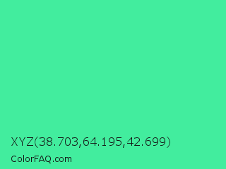 XYZ 38.703,64.195,42.699 Color is a normal green color and the nearest color is Eucalyptus #44d7a8. Hex code #42ed9e and RGB value is rgb(66,237,158). In RGB color space, this color is composed of 26% red, 93% green, 62% blue, In CMYK color space, this color is composed of 72% cyan, 0% magenta, 33% yellow , 7% black , In HSL color space, this color has a hue angle of 152° , 83% saturation and 59% lightness.