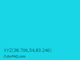 XYZ 38.706,54,83.246 Color is a normal cyan color and the nearest color is Bright Turquoise #08e8de. Hex code #18d6e6 and RGB value is rgb(24,214,230). In RGB color space, this color is composed of 9% red, 84% green, 90% blue, In CMYK color space, this color is composed of 90% cyan, 7% magenta, 0% yellow , 10% black , In HSL color space, this color has a hue angle of 185° , 81% saturation and 50% lightness.