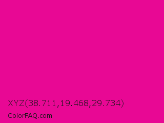 XYZ 38.711,19.468,29.734 Color is a normal magenta color and the nearest color is Hollywood Cerise #f400a1. Hex code #e80894 and RGB value is rgb(232,8,148). In RGB color space, this color is composed of 91% red, 3% green, 58% blue, In CMYK color space, this color is composed of 0% cyan, 97% magenta, 36% yellow , 9% black , In HSL color space, this color has a hue angle of 323° , 93% saturation and 47% lightness.