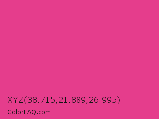 XYZ 38.715,21.889,26.995 Color is a normal rose color and the nearest color is Cerise Pink #ec3b83. Hex code #e53d8c and RGB value is rgb(229,61,140). In RGB color space, this color is composed of 90% red, 24% green, 55% blue, In CMYK color space, this color is composed of 0% cyan, 73% magenta, 39% yellow , 10% black , In HSL color space, this color has a hue angle of 332° , 76% saturation and 57% lightness.