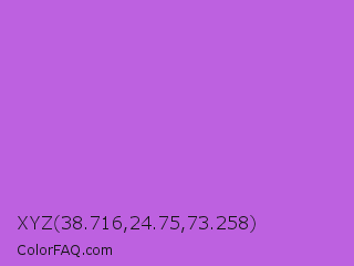 XYZ 38.716,24.75,73.258 Color is a light purple color and the nearest color is Rich Lilac #b666d2. Hex code #bd61e0 and RGB value is rgb(189,97,224). In RGB color space, this color is composed of 74% red, 38% green, 88% blue, In CMYK color space, this color is composed of 16% cyan, 57% magenta, 0% yellow , 12% black , In HSL color space, this color has a hue angle of 283° , 67% saturation and 63% lightness.