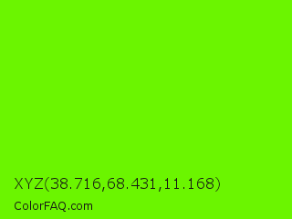 XYZ 38.716,68.431,11.168 Color is a normal green color and the nearest color is Bright Green #66ff00. Hex code #6bf500 and RGB value is rgb(107,245,0). In RGB color space, this color is composed of 42% red, 96% green, 0% blue, In CMYK color space, this color is composed of 56% cyan, 0% magenta, 100% yellow , 4% black , In HSL color space, this color has a hue angle of 94° , 100% saturation and 48% lightness.
