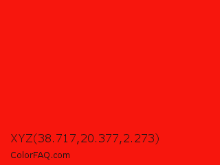XYZ 38.717,20.377,2.273 Color is a normal red color and the nearest color is Vivid Red #f70d1a. Hex code #f7160d and RGB value is rgb(247,22,13). In RGB color space, this color is composed of 97% red, 9% green, 5% blue, In CMYK color space, this color is composed of 0% cyan, 91% magenta, 95% yellow , 3% black , In HSL color space, this color has a hue angle of 2° , 94% saturation and 51% lightness.
