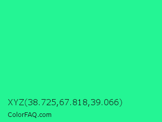 XYZ 38.725,67.818,39.066 Color is a normal green color and the nearest color is Medium Spring Green #00fa9a. Hex code #24f594 and RGB value is rgb(36,245,148). In RGB color space, this color is composed of 14% red, 96% green, 58% blue, In CMYK color space, this color is composed of 85% cyan, 0% magenta, 40% yellow , 4% black , In HSL color space, this color has a hue angle of 152° , 91% saturation and 55% lightness.
