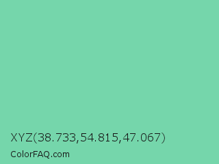 XYZ 38.733,54.815,47.067 Color is a light green color and the nearest color is Medium Aquamarine #66ddaa. Hex code #75d6ab and RGB value is rgb(117,214,171). In RGB color space, this color is composed of 46% red, 84% green, 67% blue, In CMYK color space, this color is composed of 45% cyan, 0% magenta, 20% yellow , 16% black , In HSL color space, this color has a hue angle of 153° , 54% saturation and 65% lightness.