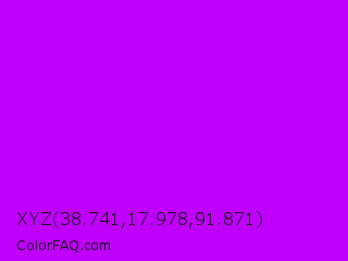 XYZ 38.741,17.978,91.871 Color is a normal purple color and the nearest color is Electric Purple #bf00ff. Hex code #bf00fa and RGB value is rgb(191,0,250). In RGB color space, this color is composed of 75% red, 0% green, 98% blue, In CMYK color space, this color is composed of 24% cyan, 100% magenta, 0% yellow , 2% black , In HSL color space, this color has a hue angle of 286° , 100% saturation and 49% lightness.