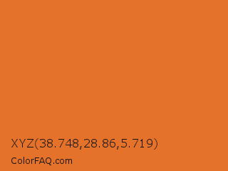XYZ 38.748,28.86,5.719 Color is a normal orange color and the nearest color is Deep Carrot Orange #e9692c. Hex code #e5722a and RGB value is rgb(229,114,42). In RGB color space, this color is composed of 90% red, 45% green, 16% blue, In CMYK color space, this color is composed of 0% cyan, 50% magenta, 82% yellow , 10% black , In HSL color space, this color has a hue angle of 23° , 78% saturation and 53% lightness.