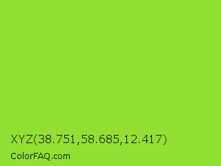 XYZ 38.751,58.685,12.417 Color is a normal green color and the nearest color is Kiwi #8ee53f. Hex code #93de33 and RGB value is rgb(147,222,51). In RGB color space, this color is composed of 58% red, 87% green, 20% blue, In CMYK color space, this color is composed of 34% cyan, 0% magenta, 77% yellow , 13% black , In HSL color space, this color has a hue angle of 86° , 72% saturation and 54% lightness.