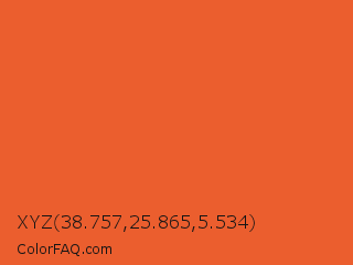 XYZ 38.757,25.865,5.534 Color is a normal color and the nearest color is Deep Carrot Orange #e9692c. Hex code #eb5e2e and RGB value is rgb(235,94,46). In RGB color space, this color is composed of 92% red, 37% green, 18% blue, In CMYK color space, this color is composed of 0% cyan, 60% magenta, 80% yellow , 8% black , In HSL color space, this color has a hue angle of 15° , 83% saturation and 55% lightness.