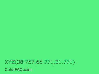 XYZ 38.757,65.771,31.771 Color is a light green color and the nearest color is Very Light Malachite Green #64e986. Hex code #53f082 and RGB value is rgb(83,240,130). In RGB color space, this color is composed of 33% red, 94% green, 51% blue, In CMYK color space, this color is composed of 65% cyan, 0% magenta, 46% yellow , 6% black , In HSL color space, this color has a hue angle of 138° , 84% saturation and 63% lightness.